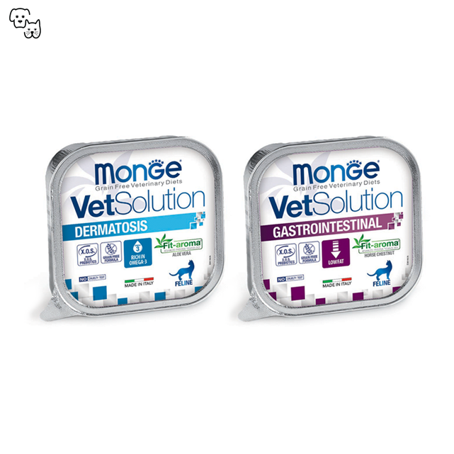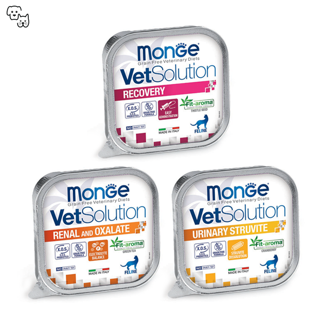 MONGE VETSOLUTION RENAL AND OXALATE FELINE is a complete dietetic feed for cats formulated for the support of renal function in the case of chronic or temporary renal insufficiency. It is also formulated for the reduction of oxalate stones formation. Contains Nucleotides to support immune system, Green tea for renal support, Xylo-oligosaccharides (XOS) to secure the intestinal microbiota. The formulation is characterized by low level of protein but high quality and restricted levels of phosphorus, low level of calcium, low level of vitamin D, and urine alkalising properties.